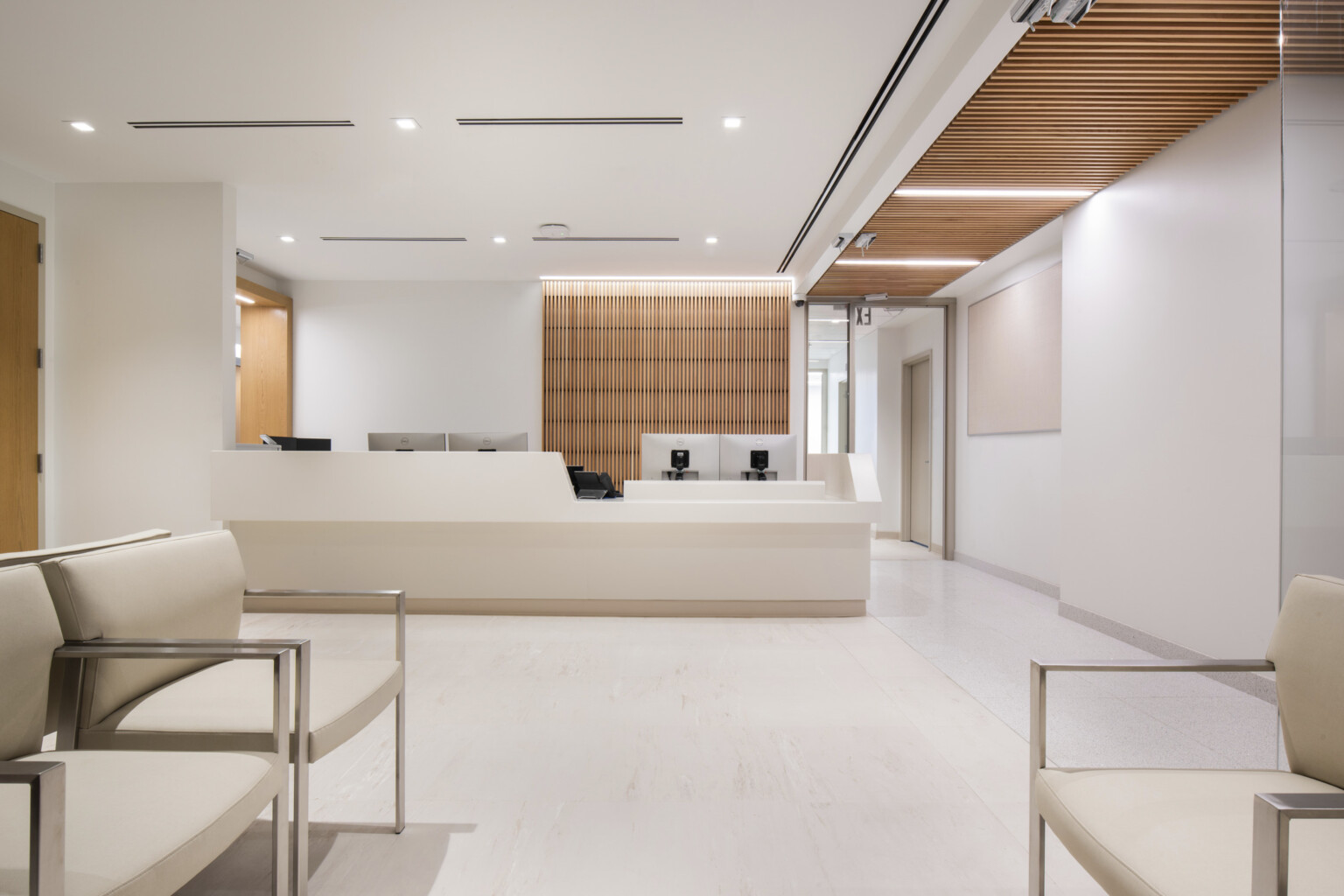 柔らかな照明と木の質感が、患者様に自然なリラックスをもたらす空間に仕上がっています。